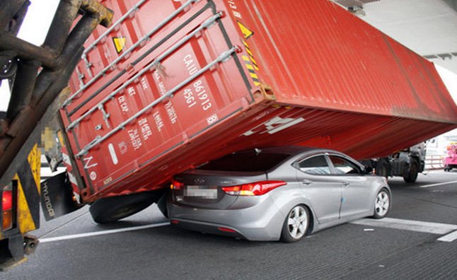 „Hyundai Elantra“ automobilį sutraiškė laivybos konteineris